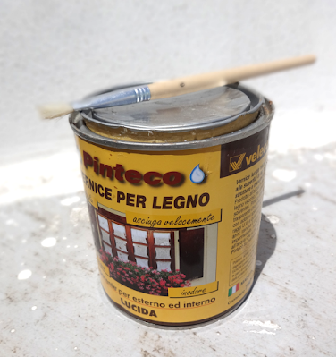Este es el barniz al agua, costaba 17€ y no quise hacer ese gasto, pero ahora que lo probé (prestado) vale la pena tenerlo, no huele a barniz y el pincel lo he lavado al chorro de agua (lo comento porque no tenia experiencia con ello)