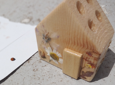 Nuevamente, como ya en alguna otra ocasión me pasó, llego esta pequeña mariquita a visitar mi trabajo, se acerco lo más que pudo y se alejo volando, no la hubiera dejado acercarse más porque se hubiera quedado pegada a la casita, pero ella misma se dio cuenta que esas flores ya no se podían probar