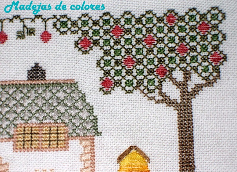 Aunque a primera vista, en esta foto puede parecer punto de cruz, si os fijáis bien, el árbol que consta de dos verdes diferentes, el más claro no lo es. Y tiene truco, porque si no se sabe a hacer, no sale bien. Y los frutos tampoco.
