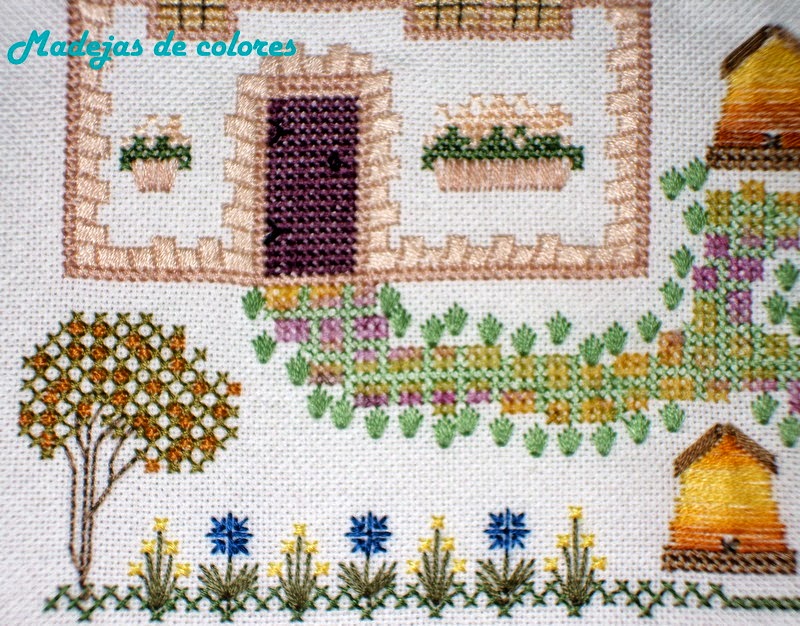 En esta se puede apreciar, los pequeños frutos del matorral, con punto diablo. Las flores azules, las hierbas, las macetas, los panales, también son puntos diferentes. El panal está hecho con hilo matizado.