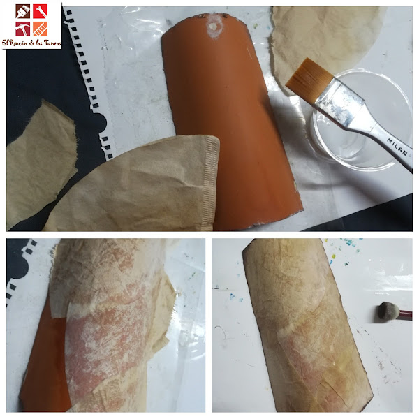 Los filtros están teñidos en café y he ido recortando y pegando con cola decoupage hasta conseguir una textura como si fuera un efecto cuero.