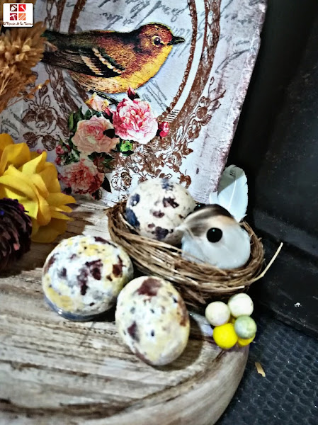 Ahora viene la parte creativa y que tanto me gusta hacer: casualmente tenía por casa un nido con un pajarillo , lo he pegado con la pistola de silicona caliente y también varios adornos florales por aquí y por allá, piña, rosas, bolitas por un lado y por el otro.
