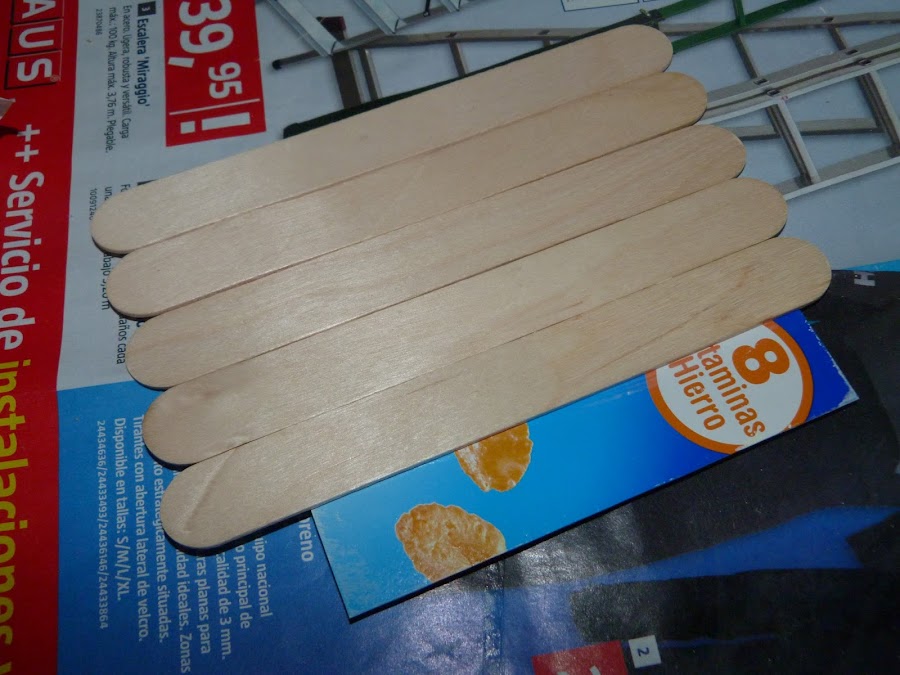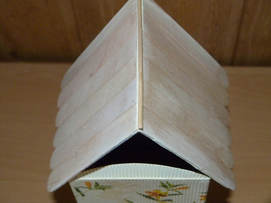 Para hacer el tejado, corté dos trozos de cartón y los cubrí con palos de madera anchos.