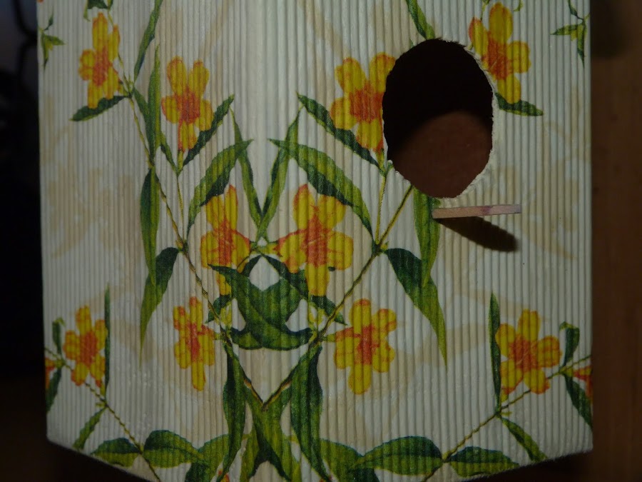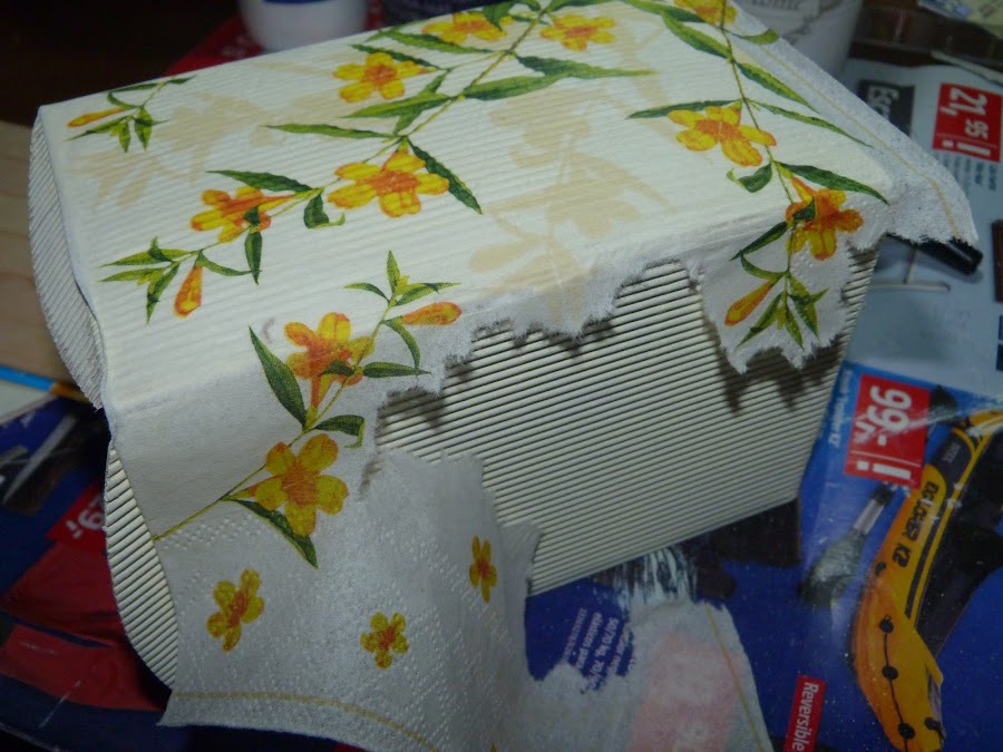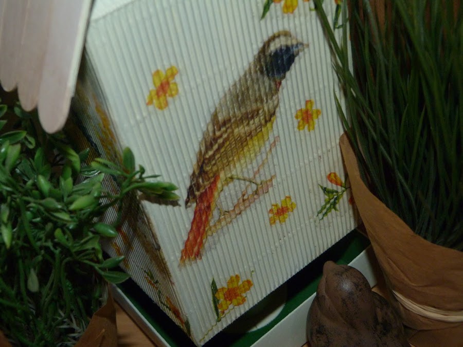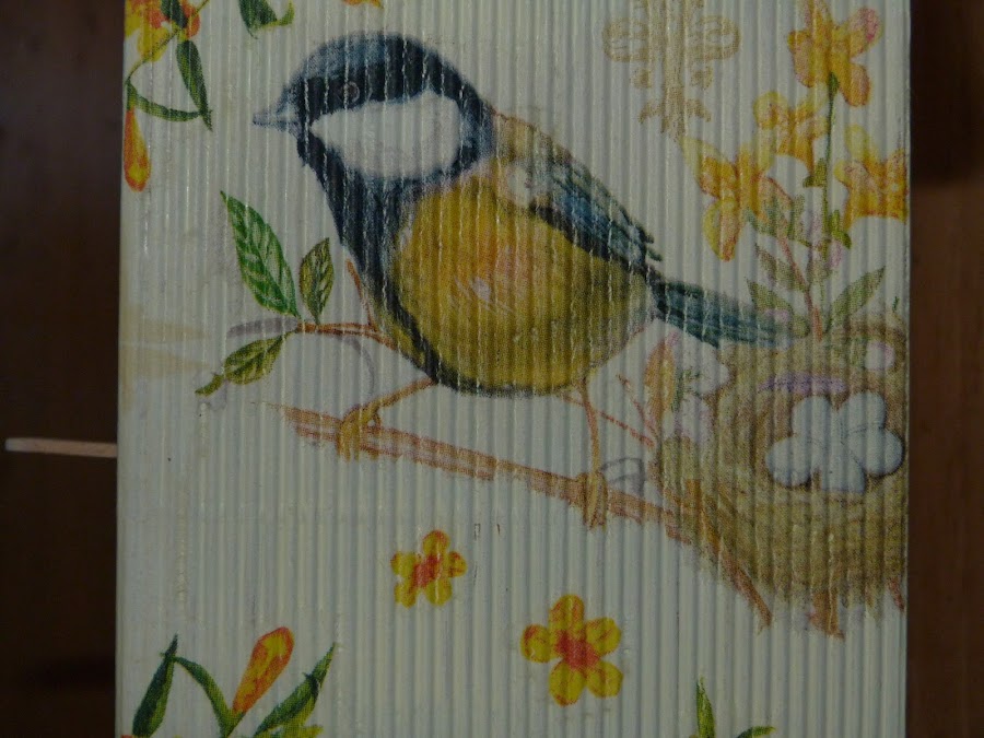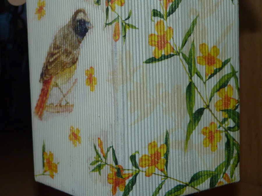 Cubrí dos laterales con ella, y los dos restantes con motivos de pájaros de otra servilleta y florecitas sueltas de la primera.