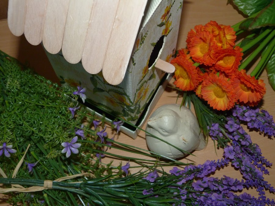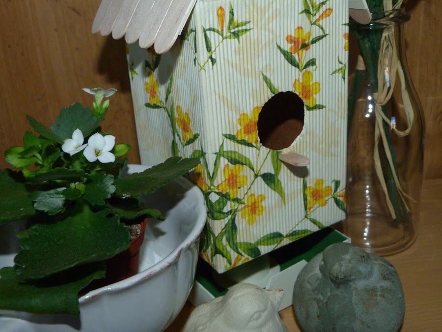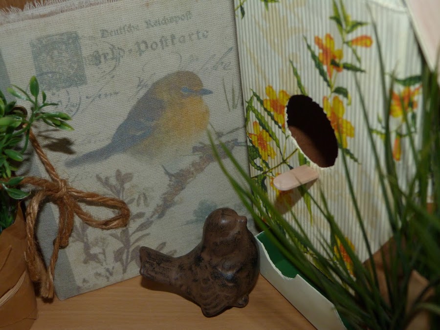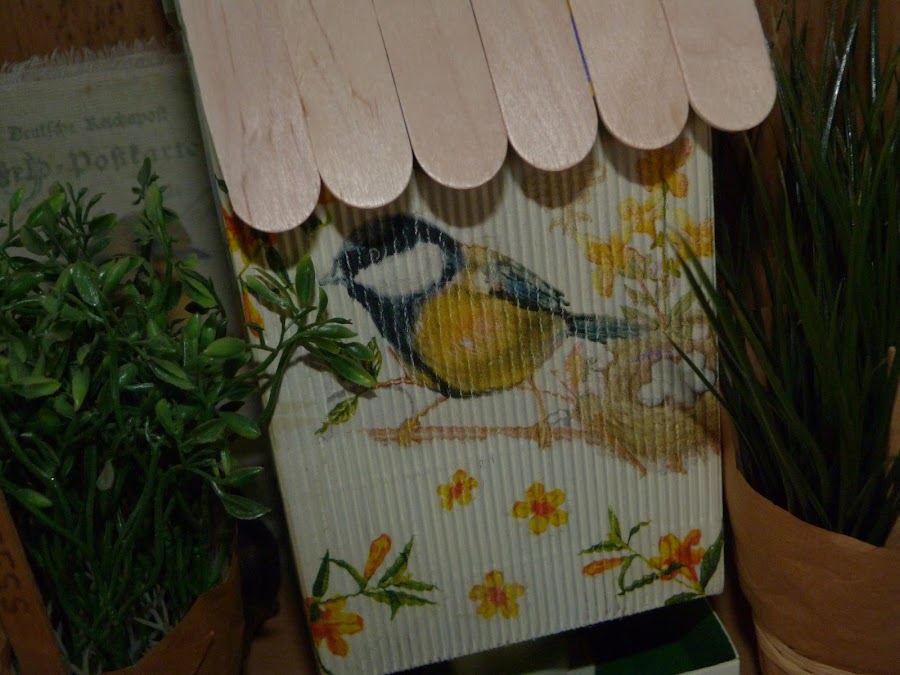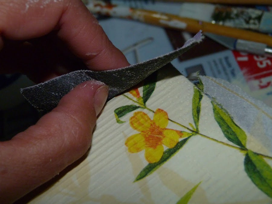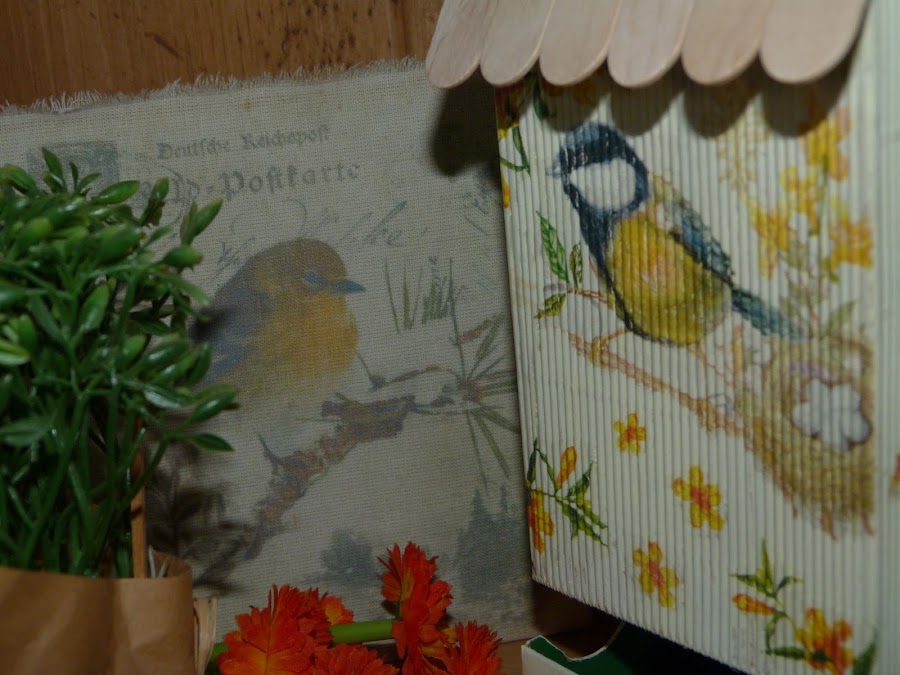 Cubrí dos laterales con ella, y los dos restantes con motivos de pájaros de otra servilleta y florecitas sueltas de la primera.