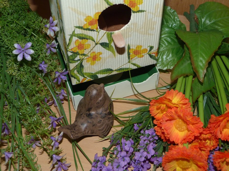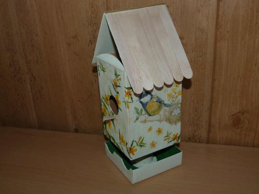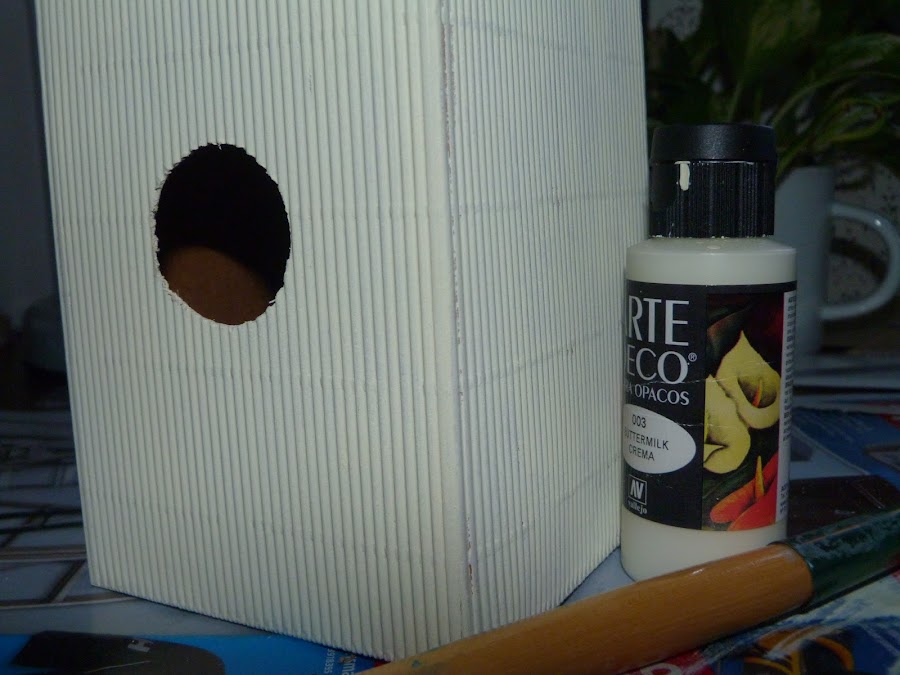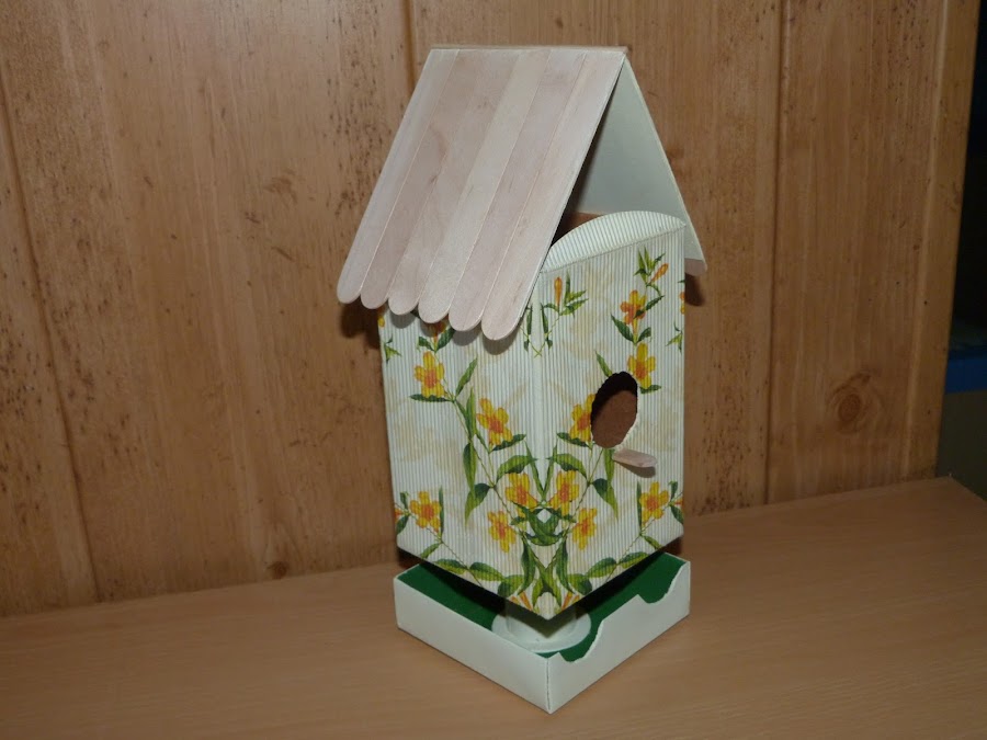 Por último, pegué la estructura a un carrete de cuerda terminado que también tenía guardado "por si acaso"... ya veis que no hay que tirar nada, porque más tarde o más temprano nos saca de algún apuro jajaja. Finalmente, todo pegado sobre la base, a la que he hecho dos aberturas para que los pájaros tengan su comedero en la parte inferior de su casita.