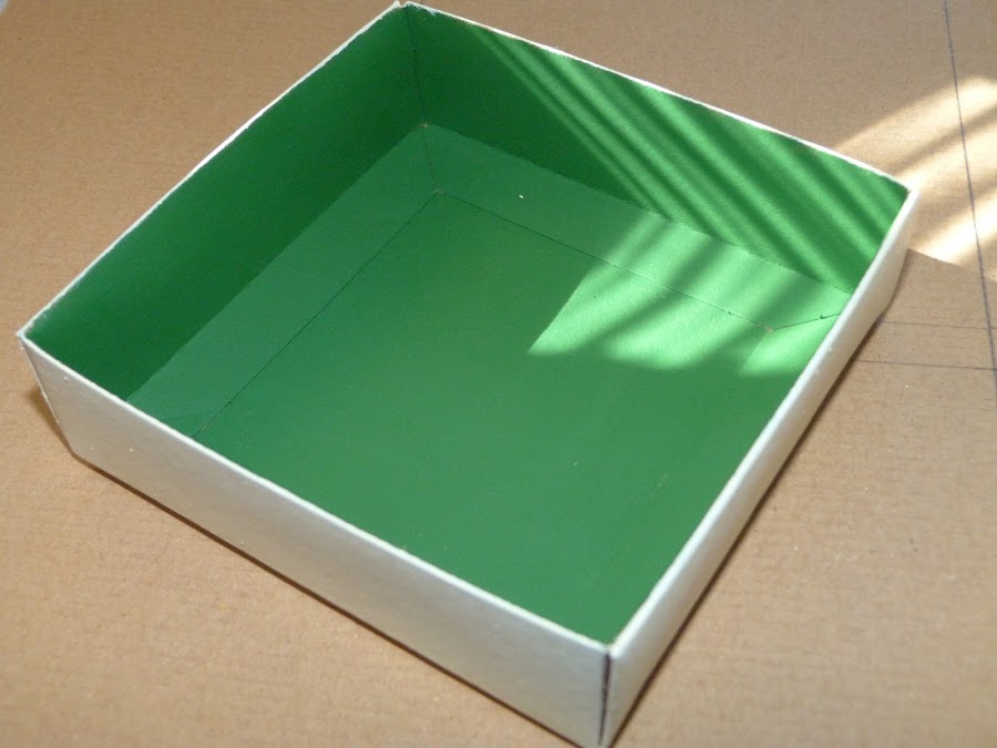 Después pinté la tapa de la caja del mismo color mantequilla por la parte exterior, y verde hoja en el interior. Esta será la base de la casita.