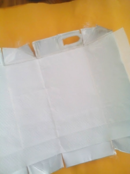 Cuando seco, le recorté todo lo sobrante de la servilleta y que quede solo la forma del cartón y doble hasta formar el envase nuevamente uniéndolo en las juntas con pegamento Universal, para ayudarlo un poco le coloqué un pedacito de cinta adhesiva de papel hasta que el pegamento estuviera bien seco.
