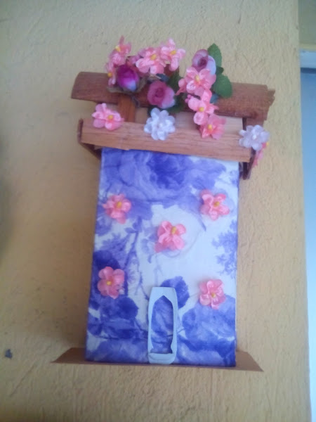 En la parte superior forme algo parecido al techo pegándole laminas de madera y sobre ellas las flores, saben que soy loca con la flores y con ellas adorno toda mi casa siempre :D