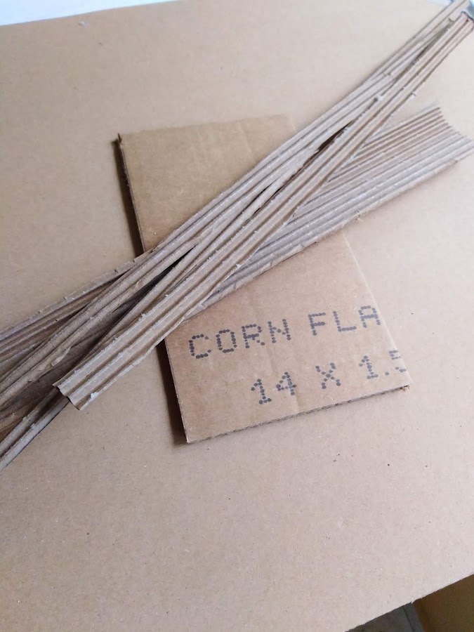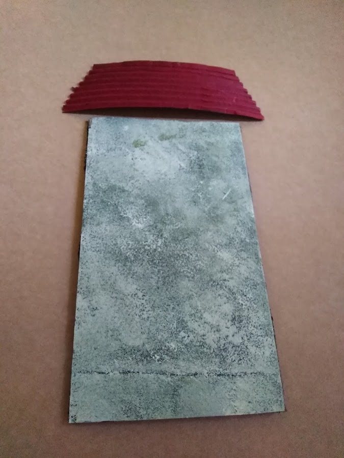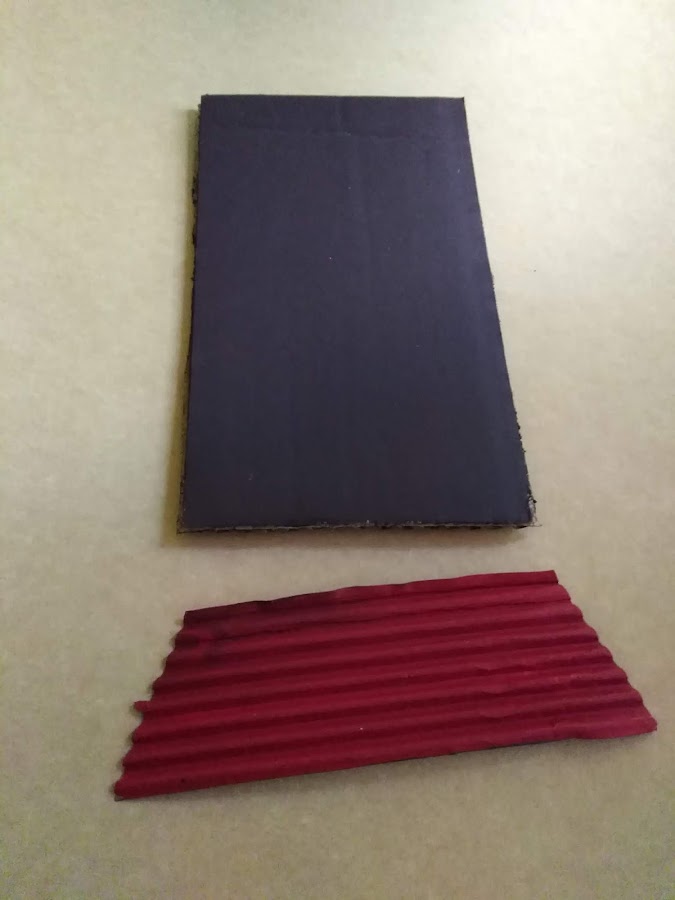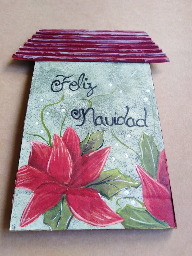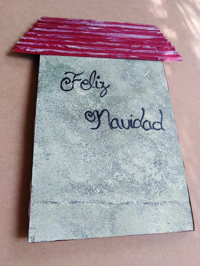 He pintado color base marrón y rojo navidad, para el techo he aprovechado las canaletas que tiene el cartón corrugado y he cortado en forma triangular