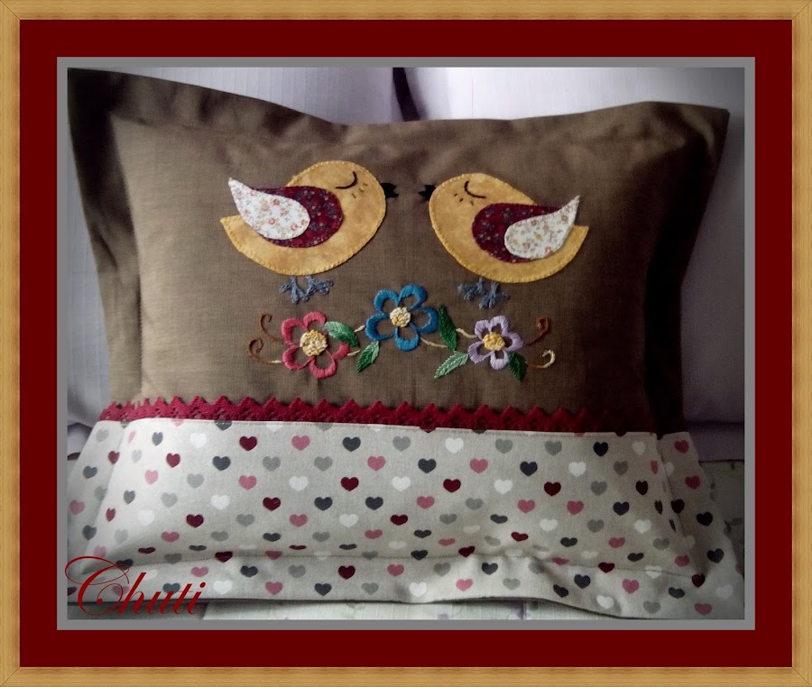 Muchas sabéis que el 30 de Mayo se celebró la boda de el hijo de nuestra amiga Loly, y yo tuve el honor de ser una de las invitadas. Ya sé que Loly les hace unas cosas preciosas, todas sabéis las manos que tiene, pero quería que tuviesen un recuerdo mio y después de darle vueltas me decidí por hacerles este tierno cojín, que me parece muy oportuno para esta ocasión, espero que les gustase porque está relleno de cariño y deseos de felicidad para esta pareja.