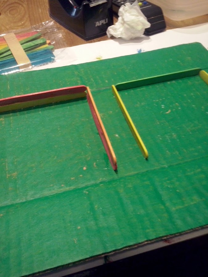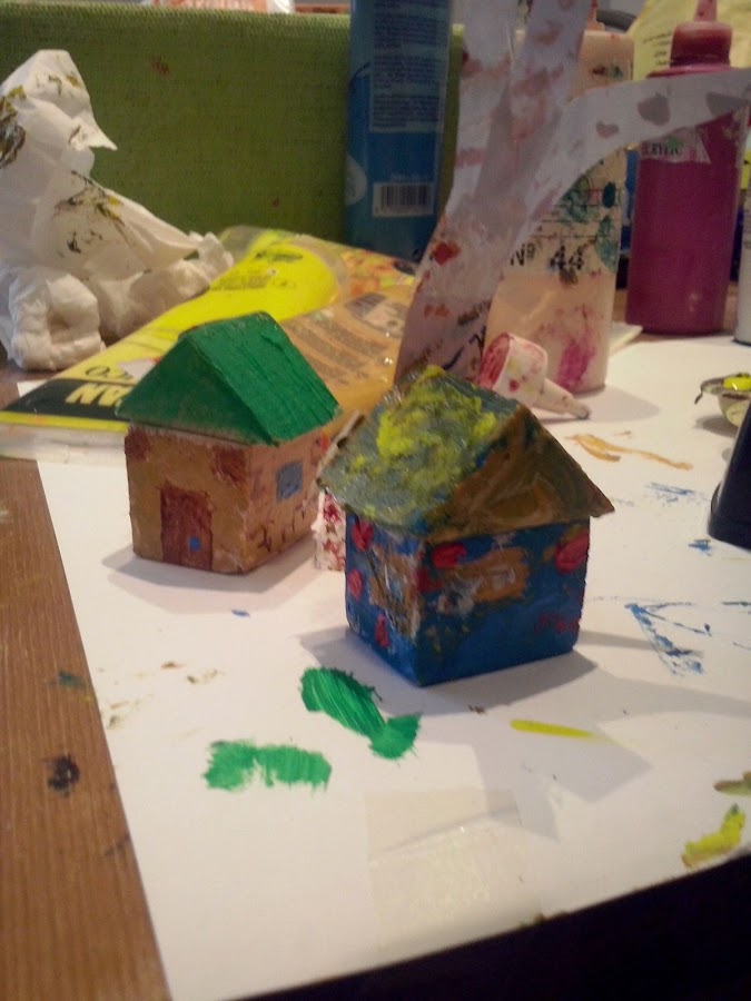 Ahora toca hacer el jardín para poner las casitas. Con un trocito de cartón lo pinta de verde y lo deja secar. Después hace una valla para cada casita con palitos de polos de colores.