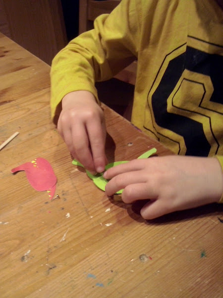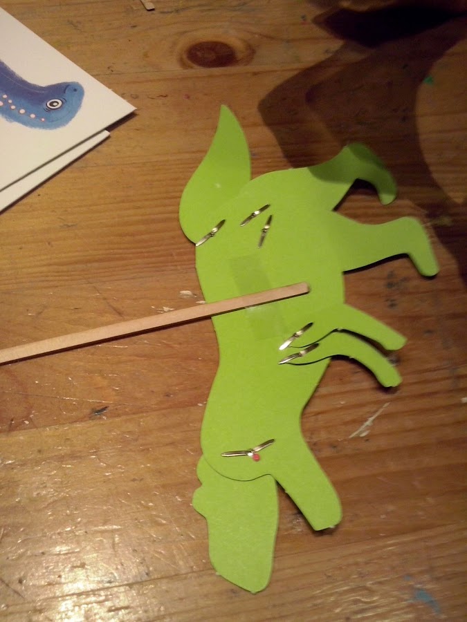 Esta mañana ha visto un juego de marionetas de dinosaurios que le encantan, así que se le ocurre hacer algo con las casitas y los dinos. Monta las piezas troqueladas y pone los encuadernadores.
