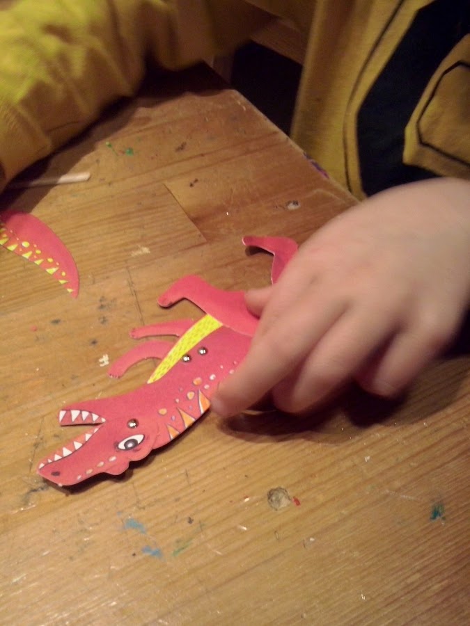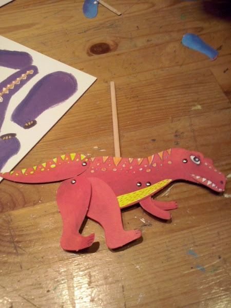 Esta mañana ha visto un juego de marionetas de dinosaurios que le encantan, así que se le ocurre hacer algo con las casitas y los dinos. Monta las piezas troqueladas y pone los encuadernadores.