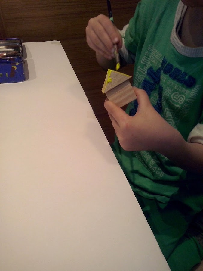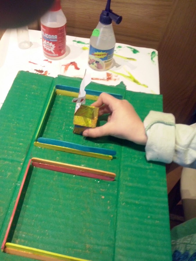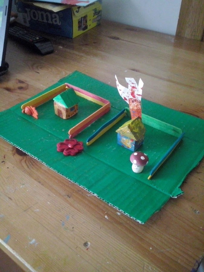 Ahora toca hacer el jardín para poner las casitas. Con un trocito de cartón lo pinta de verde y lo deja secar. Después hace una valla para cada casita con palitos de polos de colores.