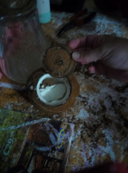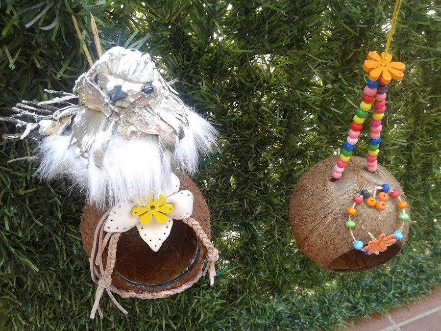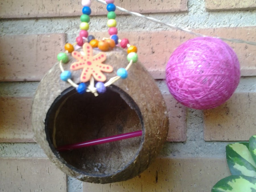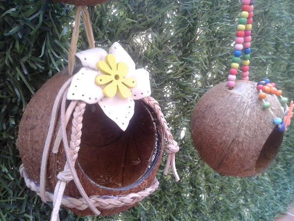 Compré dos cocos, y con la ayuda de unos amigos : Juan y María Dolores, me hizo los dos agujeros para que entren los pájaros, vino con una broca enorme, ya sabeis que yo de bricolaje, nada de nada, tambien, Juan hizo unos taladros en los agujeros del coco.