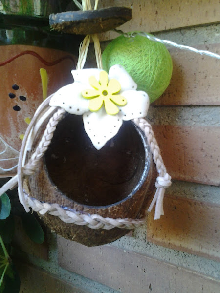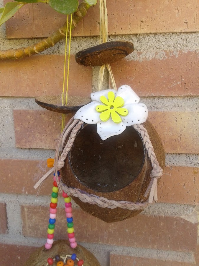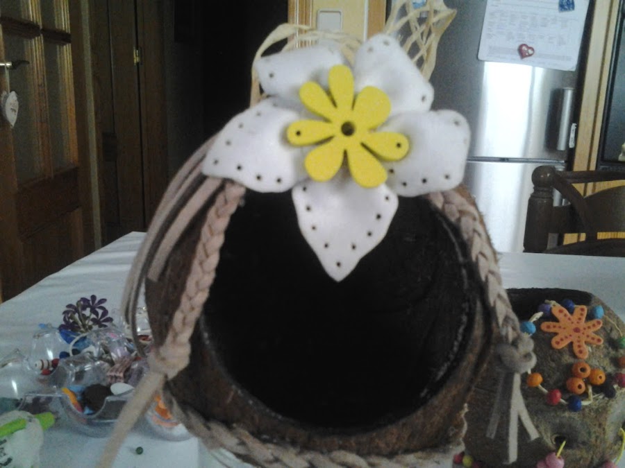 Esta es la casita de mamá pájaro y papá pájaro, utilice material reciclado, la flor blanca pertenecía a unas sandalias de verano que ya no uso, y supuse que a mamá pájaro le gustaría esta decoración, y añadí cuerda de piel vuelta, hice unas trenzas para terminar de decorarla, con un estilo mas étnico.
