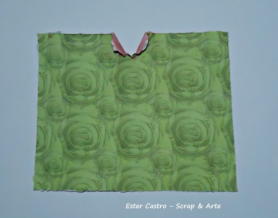 Luego corte un trozo de la lámina Rosas Verdes al cual le realice un corte en el medio a mano de esta forma y pinte la parte blanca con bruma roja