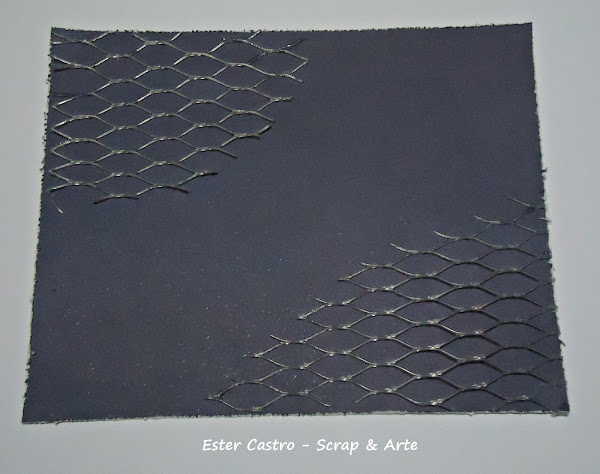 Después recorte un trozo de lámina azul, desgaste sus bordes y sobre esta aplique trozos de una malla plástica en dos ángulos