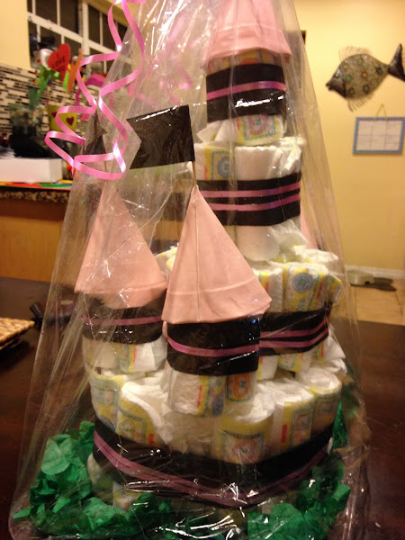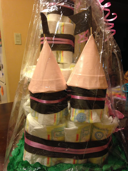 Ahora vamos a hacer los picos son 5, y cada uno lleva 3 pañales recien nacido, pon en forma de triangulo, obteniendo 5 tringulitos, tambien atalos con hilo de algodon con mucho cuidado. Decora con la cinta de tela ancha rodeando cada triangulo y tapando el hilo, con la cinta de moño rodea nuevamente cada triangulo centrado en la cinta de tela. A estos colocalos un encada costado del primer piso de pañales, y uno en la parte superior de los pañales.