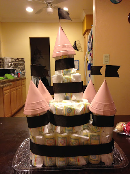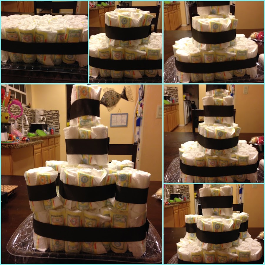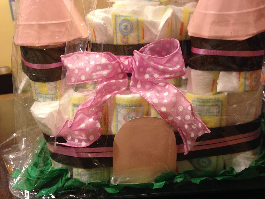 Toma 6 pañales recien nacido, ponlo en 2 filas, y tambien atalo con el hilo de algodon con mucho cuidado. Decora con la cinta de tela ancha rodeando las 2 filas y tapando el hilo, con la cinta de moño rodea nuevamente las 2 filas centrado en la cinta de tela. Colocalo encima y centrado arriba de los anteriores.