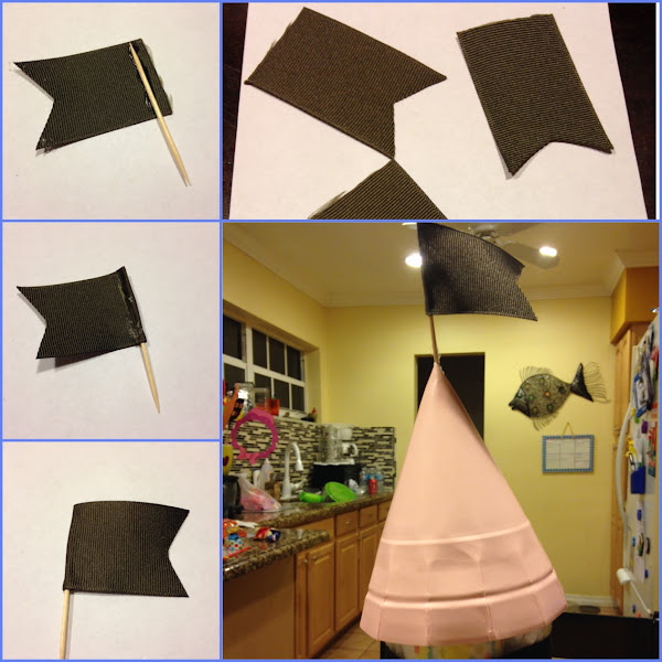 Con un pedacito de cinta de tela ancha le hacemos los banderines, la pegamos en los palitos de madera para que sean de mastil, y por ultimo lo pegamos en la punta del cono. A estos los colocamos encima de los pañales que tiene forma de triangulo.