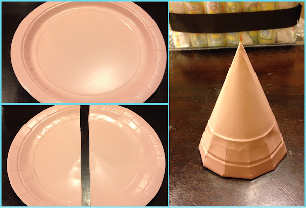 Tomamos los platos de carton y los cortamos por la mitad, doblamos la mitad para formar un cono lo pegamos con cinta adhesiva, tenemos que hacer 5 conos.