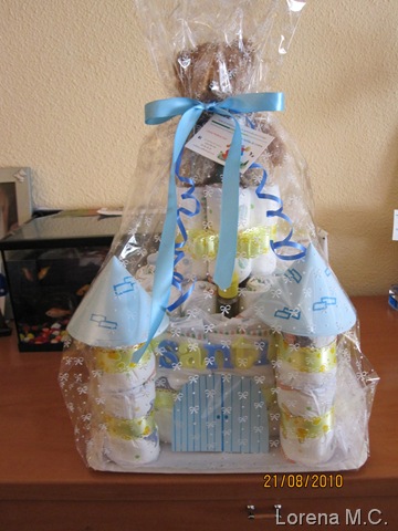 Paso 4: Hacéis los pisos que queráis, yo recomiendo 2. En el segundo piso colocar una caja para poder poner ahí los regalos del bebe. Colocáis los torreones en las esquina, montándolos alrededor de un rollo de papel de cocina. También podéis unir la parte de abajo de la torre con una cuerda al resto y los dos de encima sujetarlos enrollándolos con film transparente de cocina.