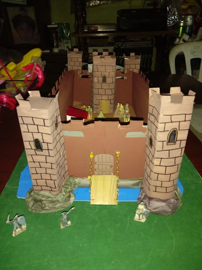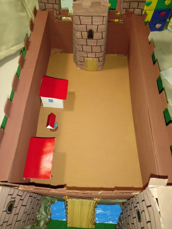 Esta hecha con dos cajas de cartón de zapatos, las columnas con cartulina blanca pintada con acrilicas y luego con plumones para simular los ladrillos y las ventanas, el agua reciclamos una caja de leche del tetrabrick y la pintamos en color azul, para el pasto usamos papel terciopelo verde, por dentro tiene un edificio mayor igual de cartulina una caballeriza, un pozo y otra casita más pequeña de cartulina.