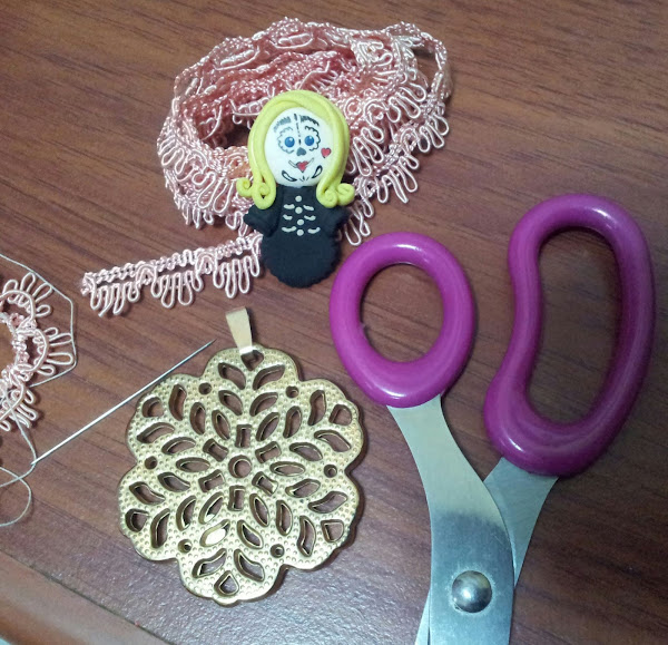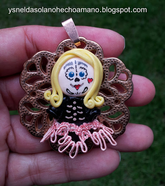 5. Con las piezas de bisutería formo una medalla, donde se coloca la figura de la Catrina en el centro de la misma. Se puede unir con silicona o con una porción pequeña de porcelana fría. Para finalizar aplicamos una capa de brillo al agua, o cualquier tipo de barniz adecuado para esto.