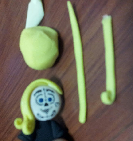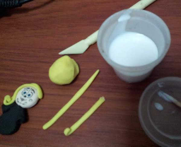3. Con tiras de porcelana fría de color amarillo, planas y muy delgadas, enrolladas en la punta, se realiza el cabello. Para unir las tiras, se utiliza cola blanca.
