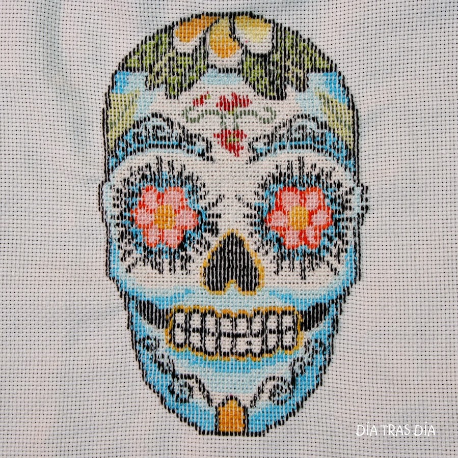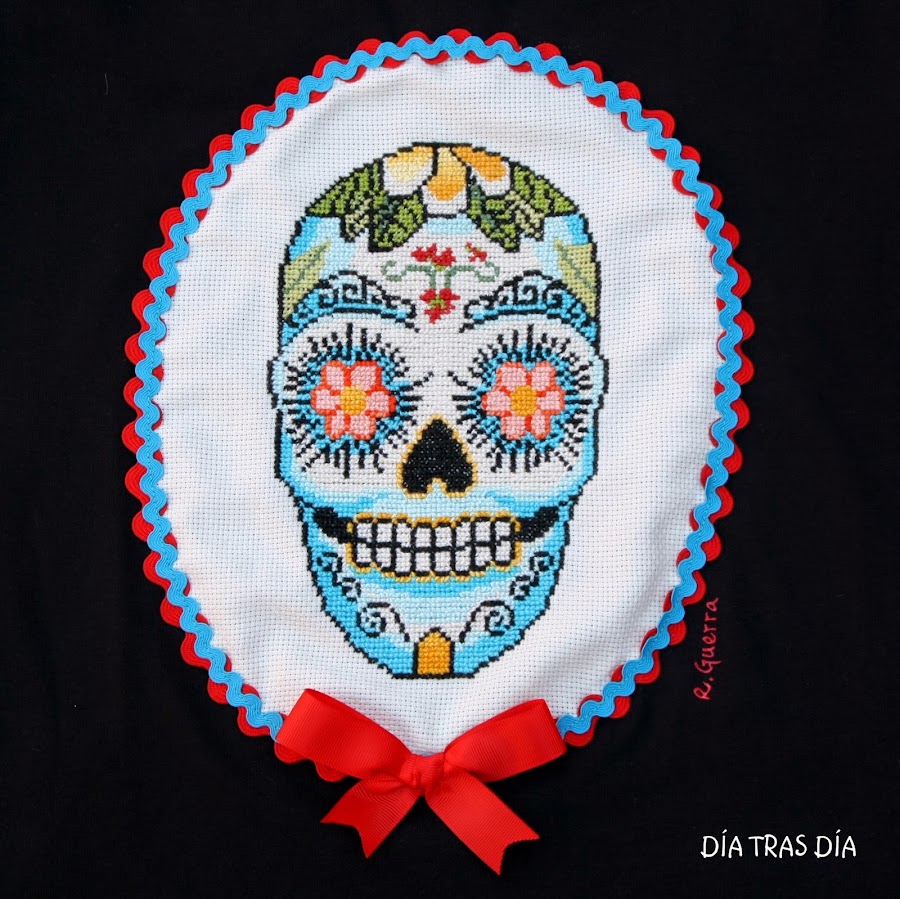 Mientras buscaba una flor para la camiseta de mi hermana, encontré un esquema de punto de cruz de una catrina, la típica calavera mejicana que se suele ver plasmada como parte de las celebraciones del día de los difuntos en ese país. Me han llamado siempre la atención estas calaveras por el contraste que tiene la temática con su representación tan llena de color.