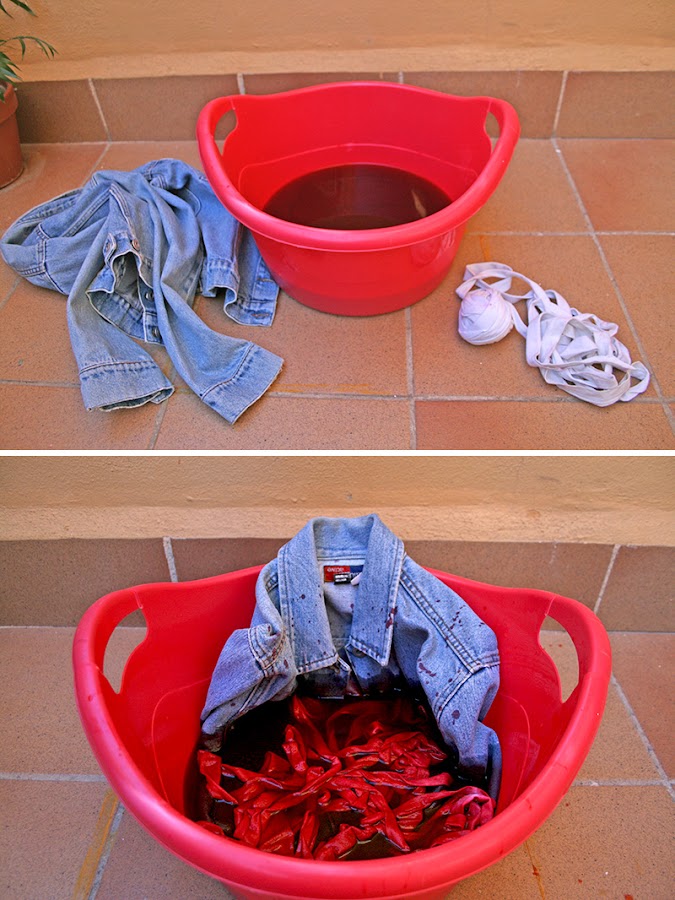 El de hoy es de darle un aire nuevo a una prenda antigua, es una cazadora que tengo desde los 14 años. Ya tuvo su momento y, como me da penilla tirarla, pensé en teñirla. Las frutas me encantan y siempre que se acerca esta época me pongo como una loca a llenar mi armario de color. En invierno soy una "pro negro" y color meto menos de lo que me gustaría y siempre acabo comprándomelo todo en negro. Será algo divertido y dará y toque original y único. Todos podéis hacerlo con cualquier prenda, en el caso de la cazadora podéis decolorarla con lejía antes, yo no lo he hecho y de igual manera el resultado me ha encantado.