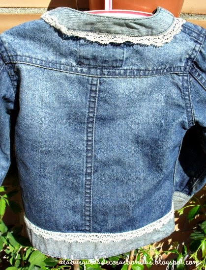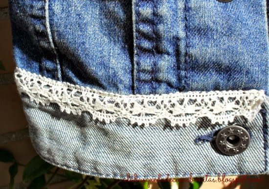 Celia tiene una cazadora vaquera que ya de por sí era diferente a las típicas cazadoras vaqueras: un diseño más de niña, además de que el cuello, las tapetas de los bolsillos y el bajo. Pero le faltaba algo...
