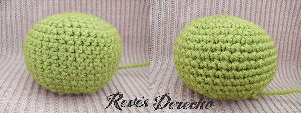 Nota: en esta última imagen, en el lado del derecho se ve un hilo hacia arriba en la parte superior. Este hilo no forma parte del tejido, sino que es el sobrante del anillo mágico y lo uso para marcar un punto. Como el amigurumi aún no está terminado, he preferido no quitarlo. En la parte del revés también se aprecia un poco.