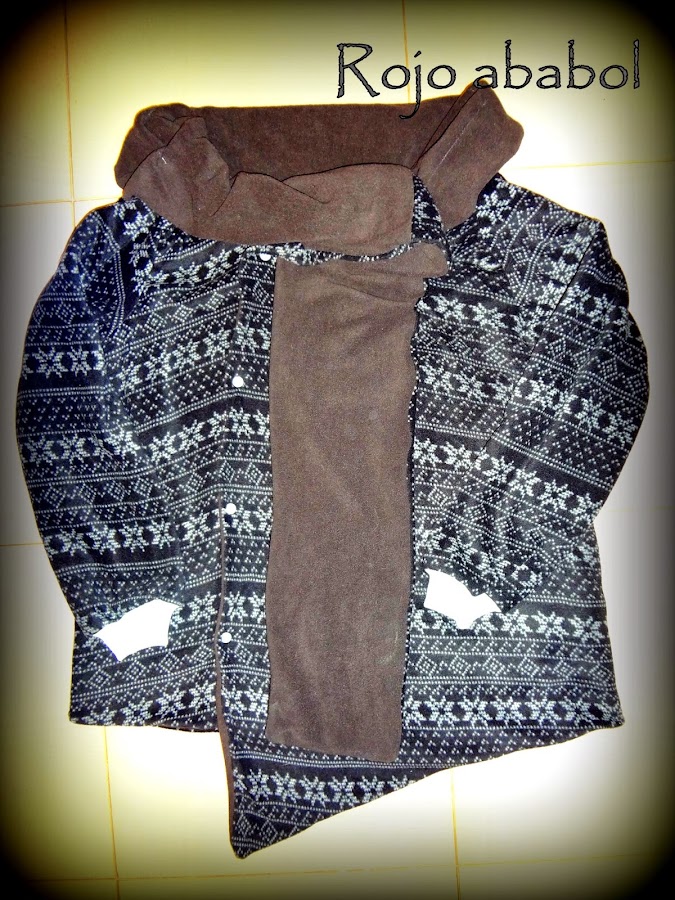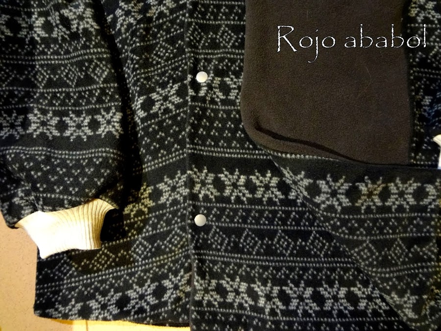 Os enseñé un avance en facebook, las que me seguís por allí sois las primeras que os enteráis de todo, jeje. Dos capas de polar, gris liso gordito para el interior y gris oscuro con dibujo jacquard en gris clarito muy suave para el exterior, ambos comprados en el mercadillo. No me resultó difícil la elección de las telas, eran los trozos de polar más grandes que tenia y además combinaban perfectamente.