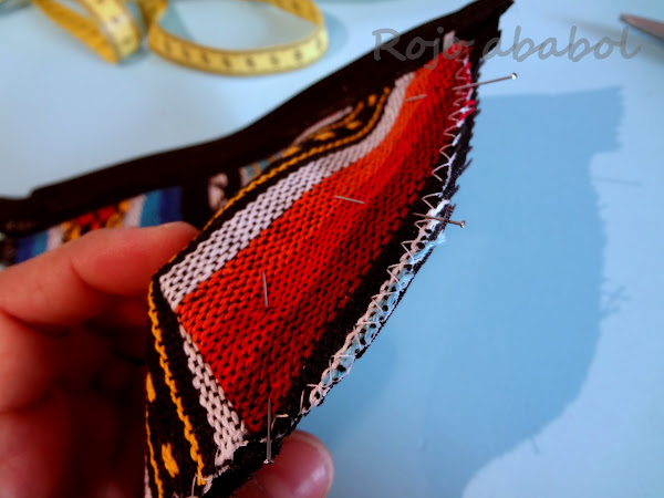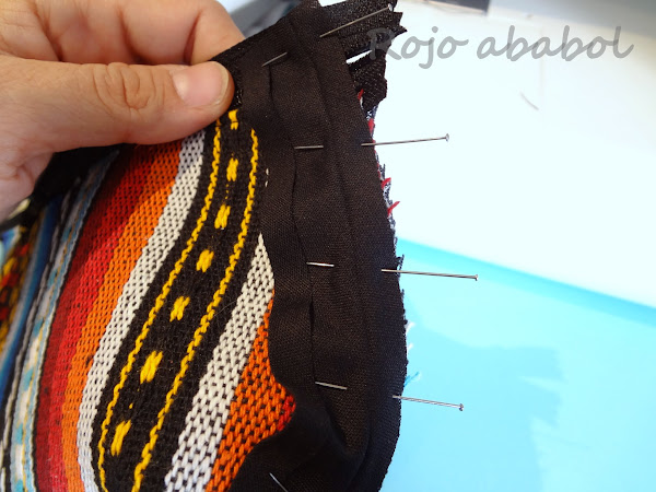 Giramos el bies hacia dentro, lo doblamos y sujetamos con alfileres todo el contorno. Podéis si queréis hilvanar... yo lo dejo así hasta mañana que lo montaremos en el cuerpo de la riñonera, jeje
