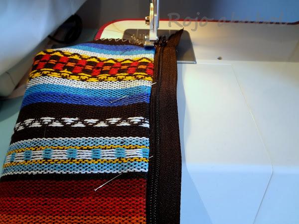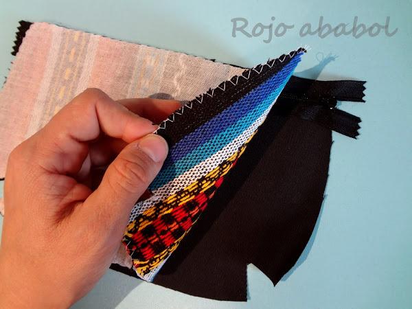 Empezamos a montar el bolsillo fuelle. Para eso colocamos la cremallera, con el carro mirando arriba, entre las dos caras de las telas que lo formarán. Abajo el forro y arriba la exterior.