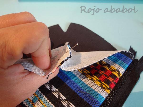 Vamos a colocar el bies, para ello lo abrimos y lo vamos sujetando a lo largo de todo el contorno del bolsillo, empezando un pelín más arriba del final de la cremallera.