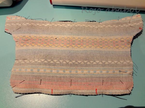 Sujetamos bien con alfileres y cosemos dejando el hueco de abajo y las salidas del cinturón sin coser (marcas en rojo)