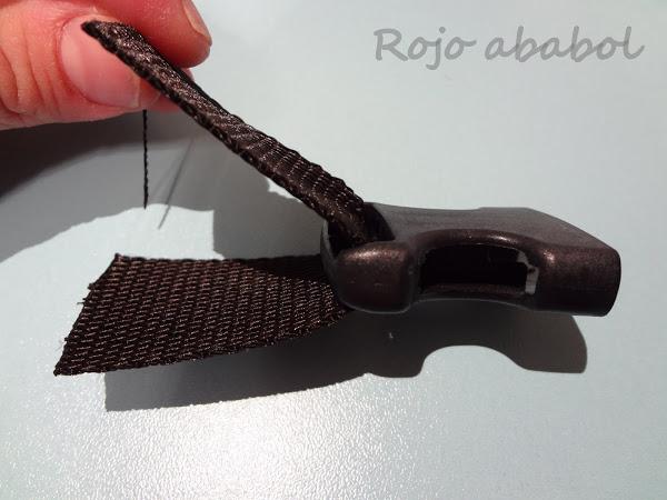 Vamos a cortar un trozo de cinta, unos 10cm, y pasarla por el cierre de esta manera.