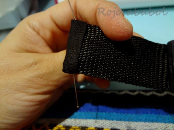 Por el hueco que hemos dejado abajo será por donde pasaremos ahora las dos partes del cinturón y luego daremos la vuelta a la riñonera.