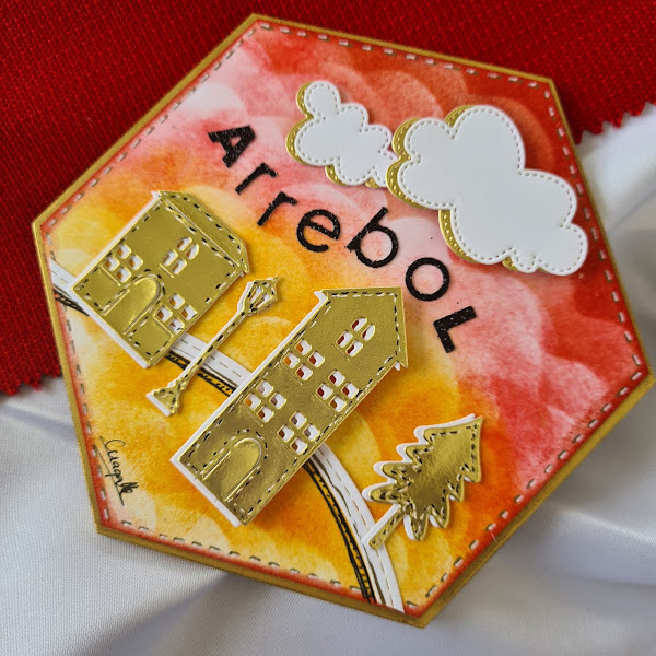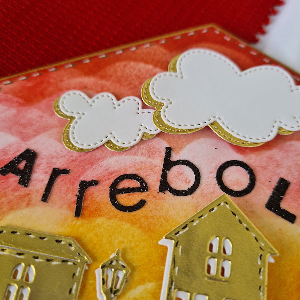Para hacer el fondo usé una plantilla en forma de nube y entinté con diferentes tonos de rojo y naranja, una técnica fácil y que crea un efecto bonito.