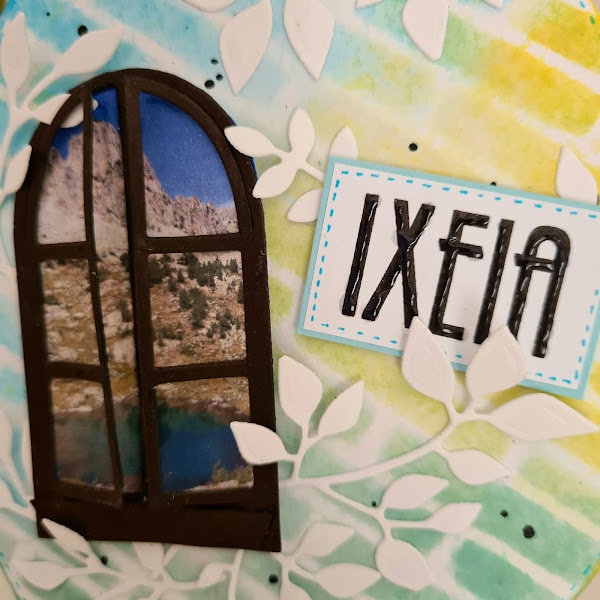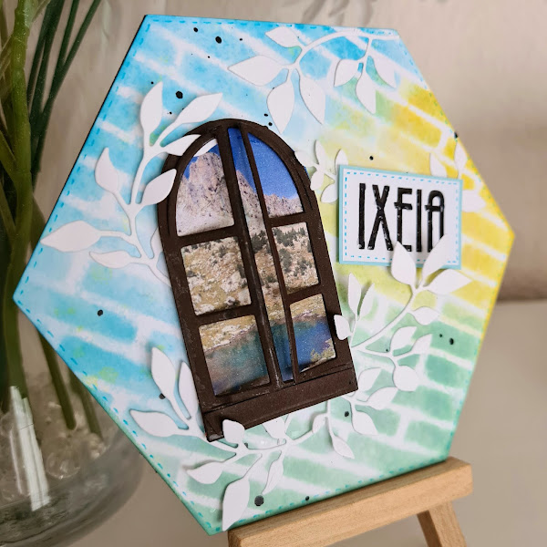 Utilicé un stencil de ladrillos para el fondo dando color con tintas, sobre él, una ventana troquelada y ramas en blanco para crear volumen.