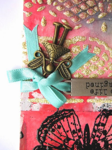Aquí, ya empezó a no gustarme el resultado de mi tag. No sé si fue porque la tinta no era negra pero? con los polvos transparentes la mariposa no "resaltaba" tanto como la de Tim Holtz.