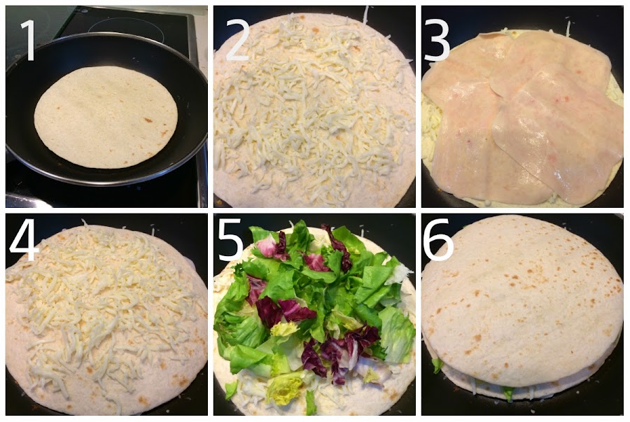 Para los mayores añado una capa más, con verdura -cruda- (en este caso eché lombarda, achicoria y escarola) y un poco de queso para que al derretirse no se mueva la tortita. Se dora por ambas partes 2 o 3 minutos y ya está.