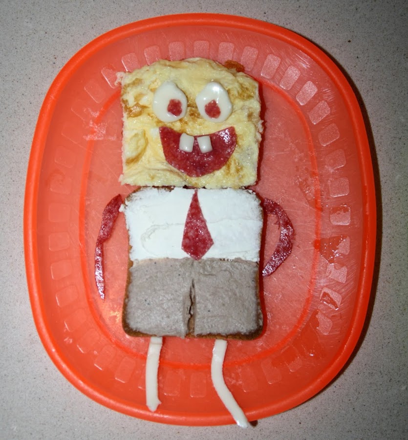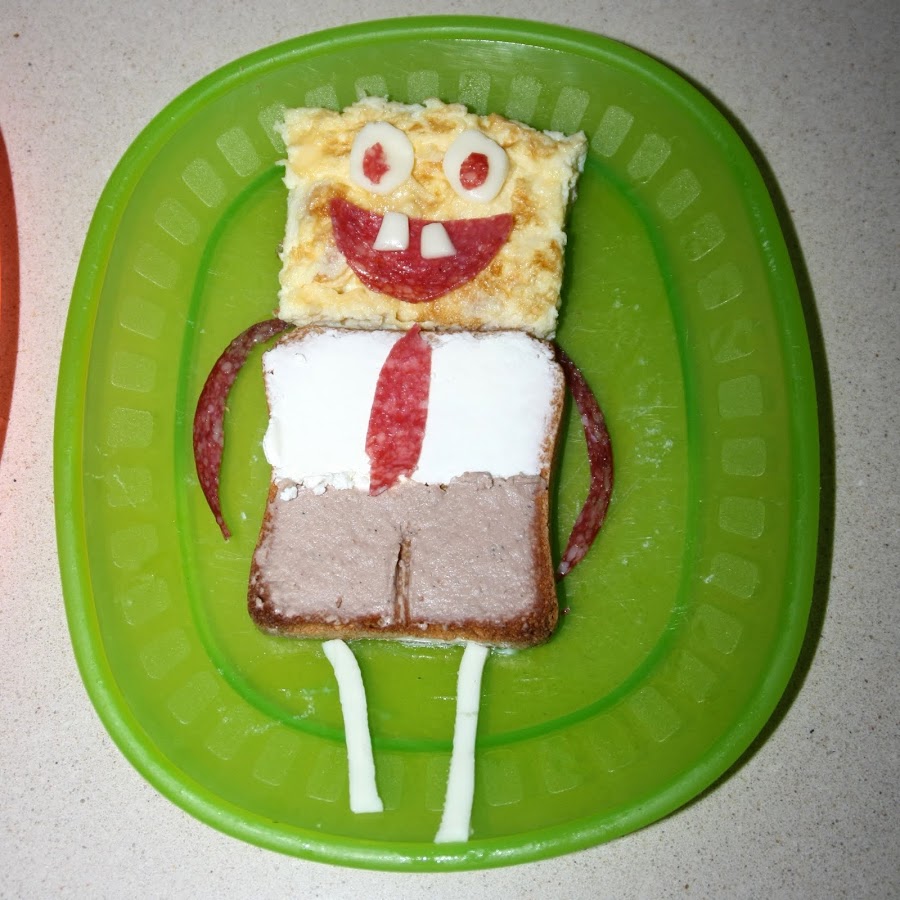 Por si alguien se anima a hacerlo, decir que, además de echarle un poco de imaginación, lo hicimos con una tortilla que cortamos con forma cuadrada. El cuerpo es un biscote de pan tostado untado con paté en la parte del pantalón y queso de untar para la camisa. La boca, la corbata y los brazos se hicieron con salami y los ojos, los dientes y las piernas con una loncha de queso.