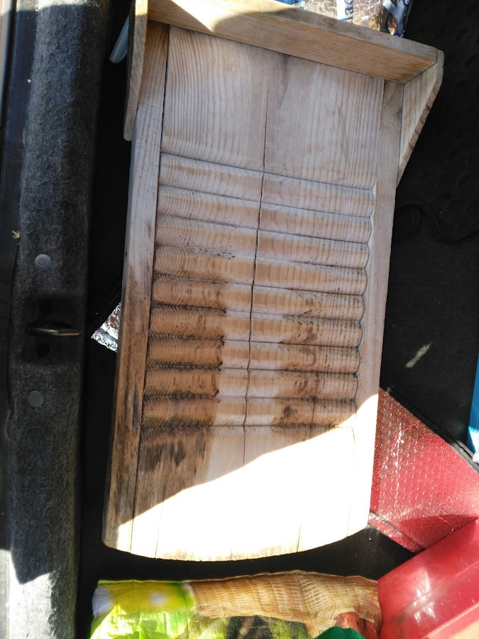 Aquí os presento la tabla Cenicienta, jajajaja, pasó de una tabla de lavar vieja a punto de servir de leña a un precioso platero que luce en mi cocina.