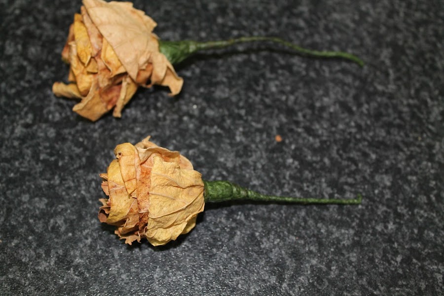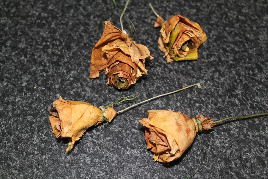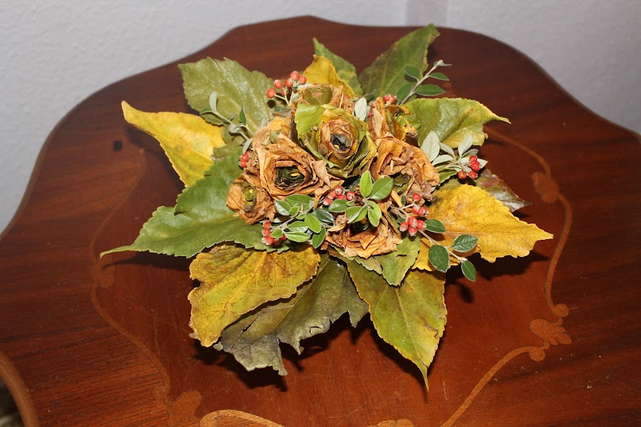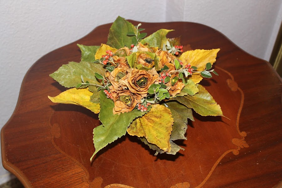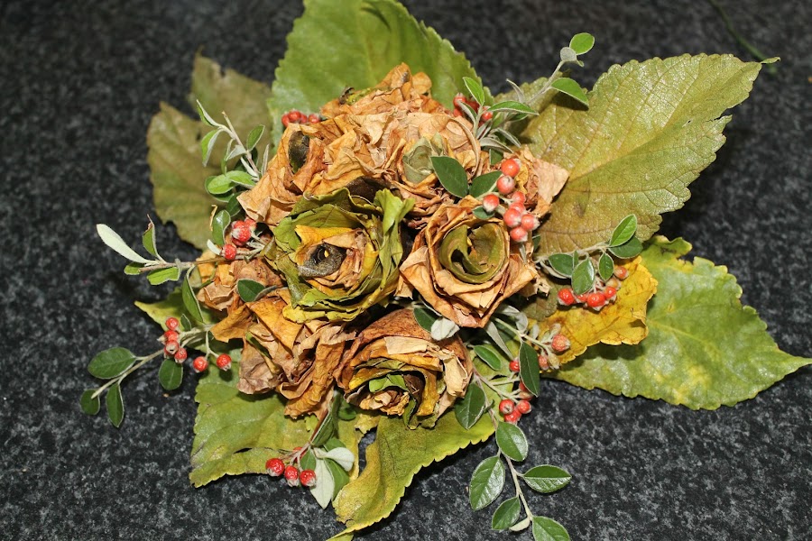 En uno de mis paseos con mi perro me estaba fijando en las hojas que van cayendo de los árboles, pensando en hacer alguna cosilla para estas Navidades cogí alguna y me puse a enrollarlas y surgió la idea de formar pequeñas rosas secas, ya que cuando me regalan algún ramo de flores me gusta secarlas he aquí lo que he realizado queda bonito ,rápido de hacer y encima muy barato