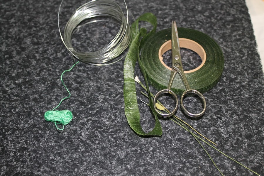 Utilizo alambre ,hilo y cinta verde la que se utiliza para hacer flores de papel, cortamos el alambre y comenzamos a doblar y enroscar muy juntas las hojas, pasando después a enrollar la cinta verde y a montar el centro